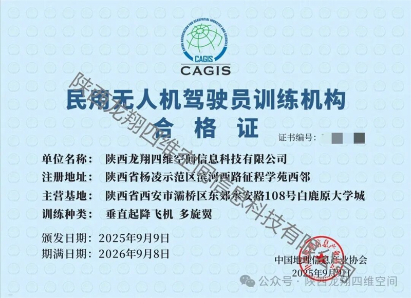 days 09 /12 熱烈祝賀陜西龍翔四維空間信息科技有限公司成功取得民用無人機駕駛員訓(xùn)練機構(gòu)合格證! 恭喜陜西龍翔四維空間信息科技有限公司斬獲民用無人機駕駛員訓(xùn)練機構(gòu)合格證!這是專業(yè)實力的硬核認證,也是信任的基石,愿以此為起……